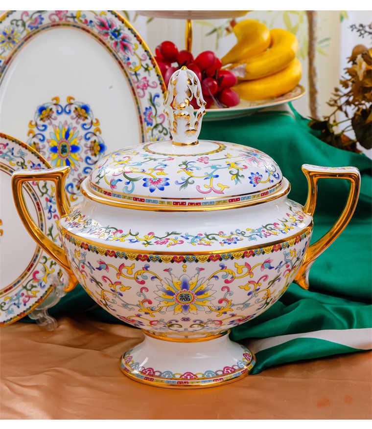 86頭白底鉤藤琺瑯彩,一個(gè)湯煲,一個(gè)飯勺,一個(gè)魚盤,一個(gè)10.5寸平盤,一個(gè)10.5寸月光盤,雙層果盤一個(gè),一個(gè)大煙缸,一個(gè)小煙缸,二個(gè)調(diào)料罐,一個(gè)牙簽筒,四個(gè)面碗,十個(gè)4.5寸飯碗,十個(gè)三寸調(diào)味碟,十個(gè)4寸湯碗,十個(gè)調(diào)羹,十個(gè)7寸骨碟,十個(gè)8寸盤,十個(gè)筷子架。