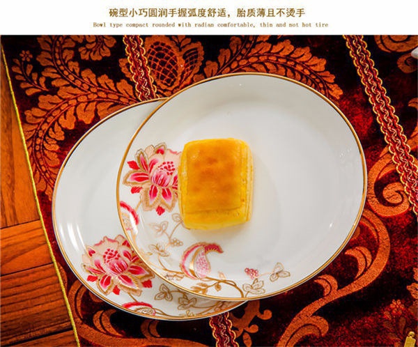 65頭醉花吟,一個湯煲,一個魚盤,一個大飯勺,一個大湯碗,一個牙簽筒,六個面碗,四個三寸碟,十個盤子,十個4.5寸飯碗,十個五寸骨碟,十個調(diào)羹,十個筷子架。