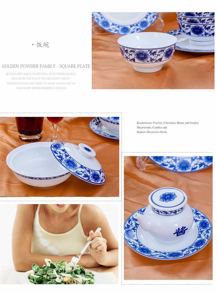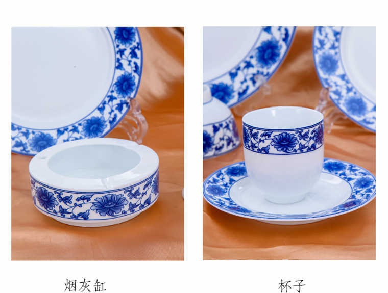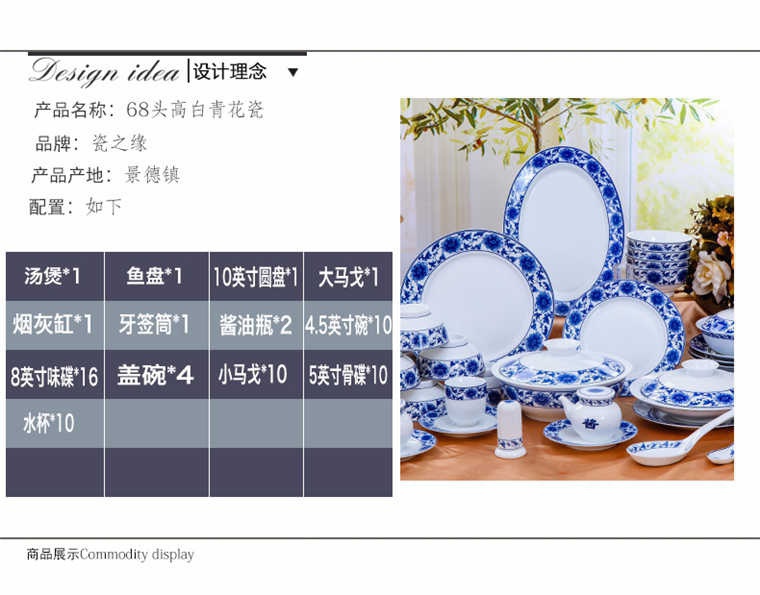 68頭高白青花瓷,一個湯煲,一個魚盤,一個10寸圓盤,一個大馬戈,一個煙缸,一個牙簽筒,兩個醬醋瓶,十個4.5寸碗,十六個8寸碟,四個蓋碗,十個小馬戈,十個5寸骨碟,十個水杯。