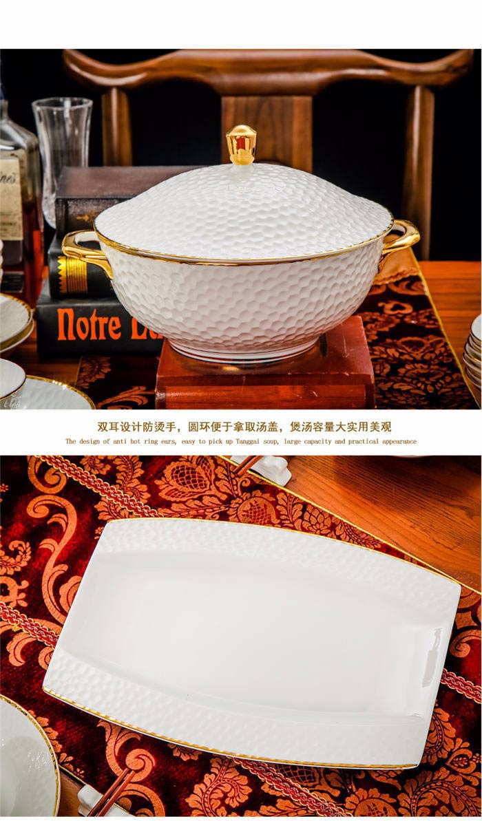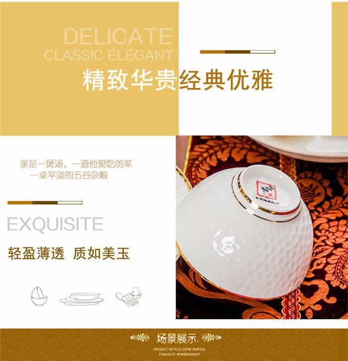 60頭水立方,一個(gè)湯煲,一個(gè)魚盤,一個(gè)十寸圓盤,一個(gè)飯勺,一個(gè)花籃,一個(gè)牙簽筒,四個(gè)面碗,十個(gè)4.5寸飯碗,十個(gè)三角骨碟,十個(gè)八寸盤,十個(gè)調(diào)羹,十個(gè)筷子架。
