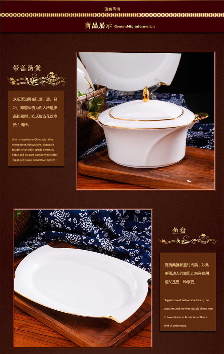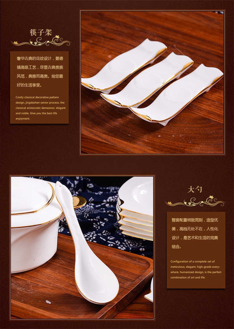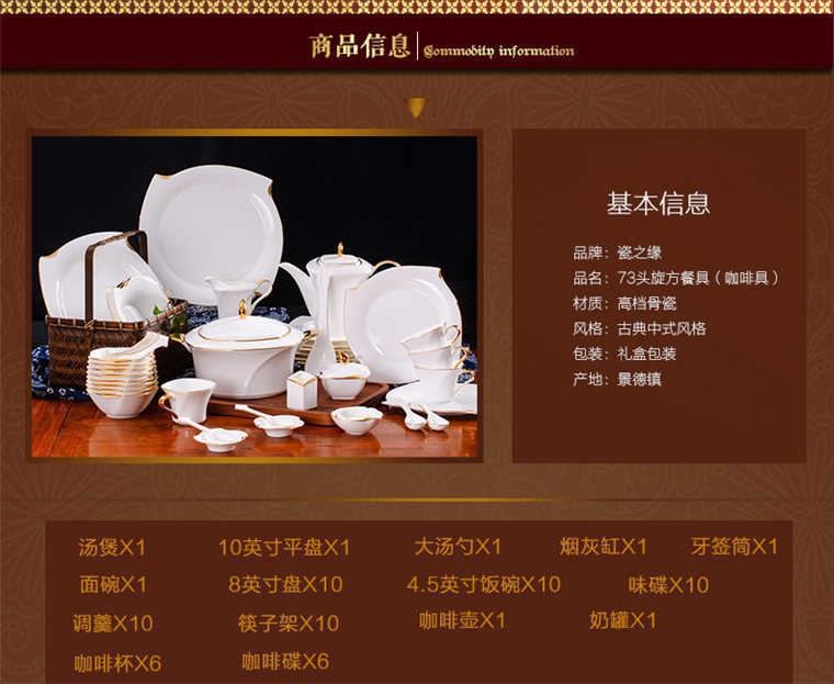 73頭旋方帶咖啡具,餐具一個(gè)湯煲,一個(gè)魚盤,一個(gè)十寸平盤,一個(gè)大湯勺,一個(gè)煙缸,一個(gè)牙簽筒,兩個(gè)面碗,十個(gè)八寸盤,十個(gè)4.5寸飯碗,十個(gè)味碟,十個(gè)調(diào)羹,十個(gè)筷子架??Х染咭粋€(gè)咖啡壺,一個(gè)糖缸,一個(gè)奶罐,六個(gè)杯子,六個(gè)碟子。