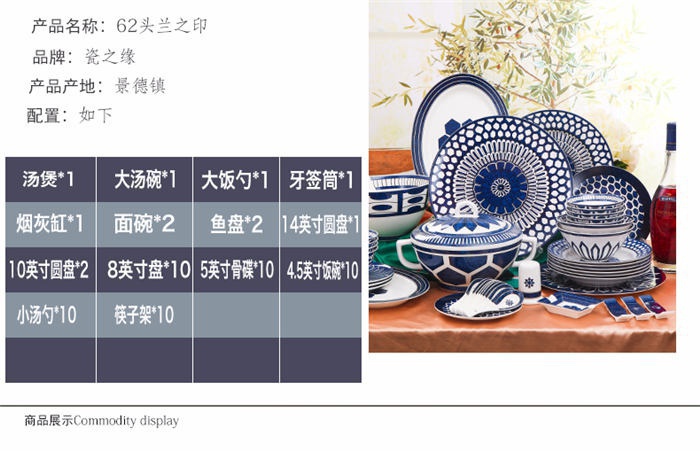 62頭蘭之印,一個(gè)湯煲,一個(gè)大湯碗,一個(gè)大飯勺,一個(gè)牙簽筒,一個(gè)煙灰缸,兩個(gè)面碗,兩個(gè)魚(yú)盤(pán),一個(gè)14寸圓盤(pán),兩個(gè)10寸圓盤(pán),十個(gè)8寸盤(pán),十個(gè)4.5寸飯碗,十個(gè)5寸骨碟,十個(gè)小湯勺,十個(gè)筷子架。