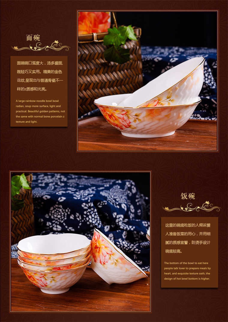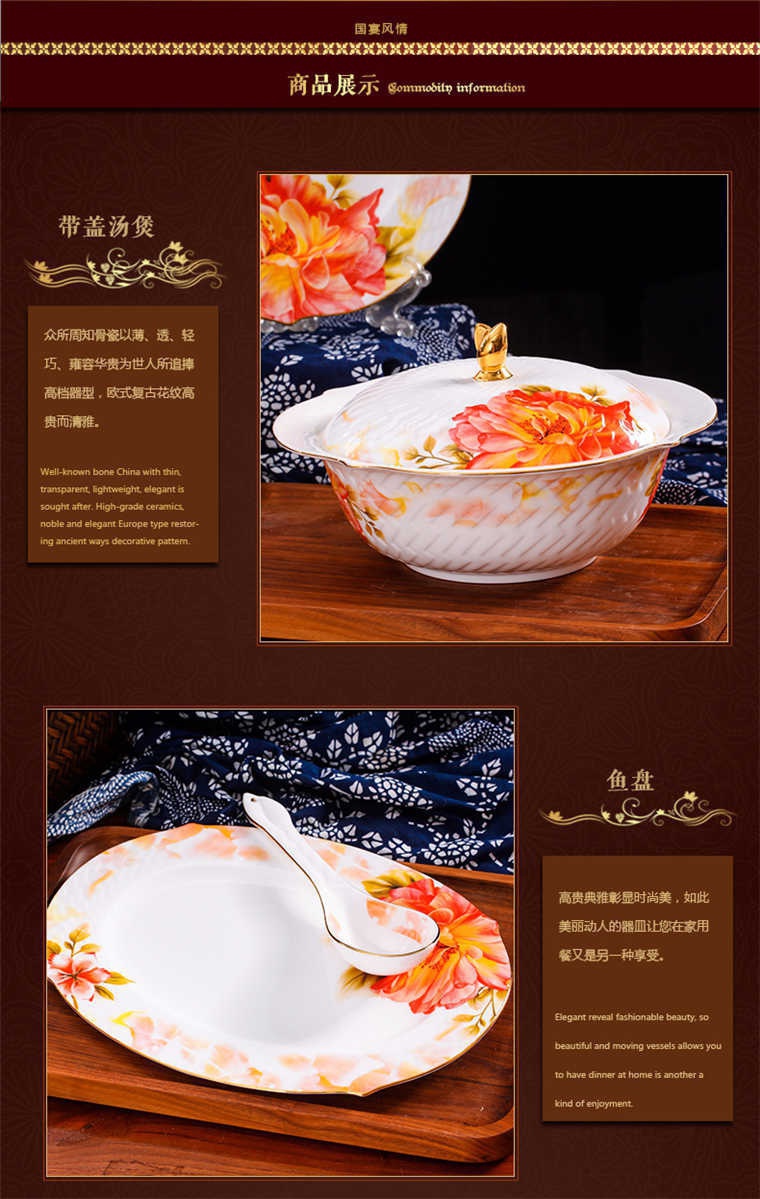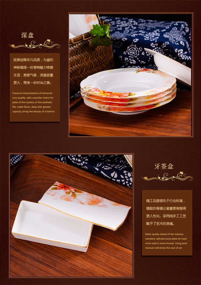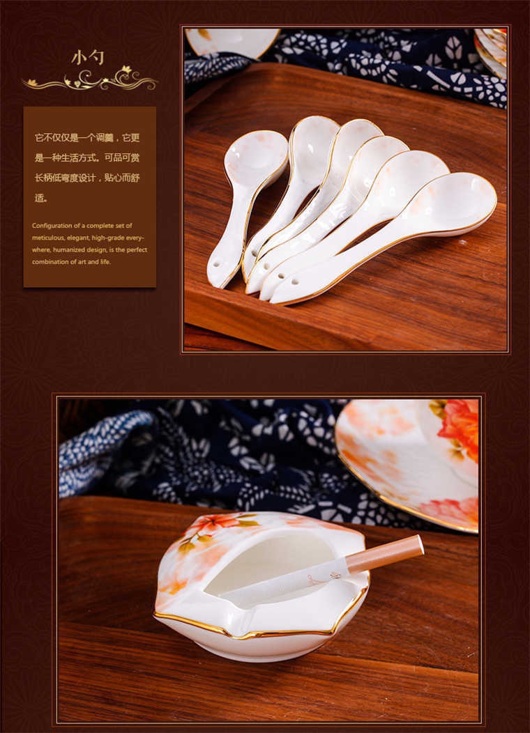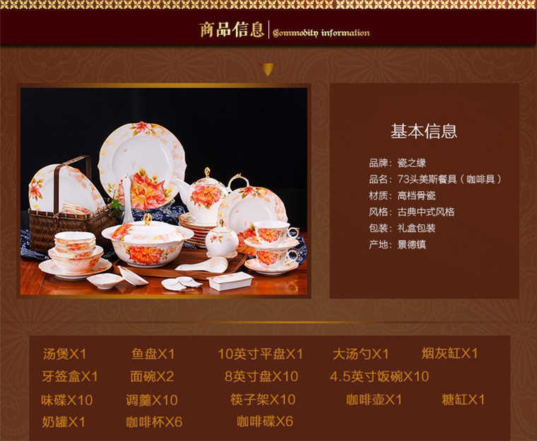 73頭美斯帶咖啡具,餐具一個湯煲,一個魚盤,一個十寸平盤,一個大湯勺,一個煙缸,一個牙簽筒,兩個面碗,十個八寸盤,十個4.5寸飯碗,十個味碟,十個調(diào)羹,十個筷子架??Х染咭粋€咖啡壺,一個糖缸,一個奶罐,六個杯子,六個碟子。